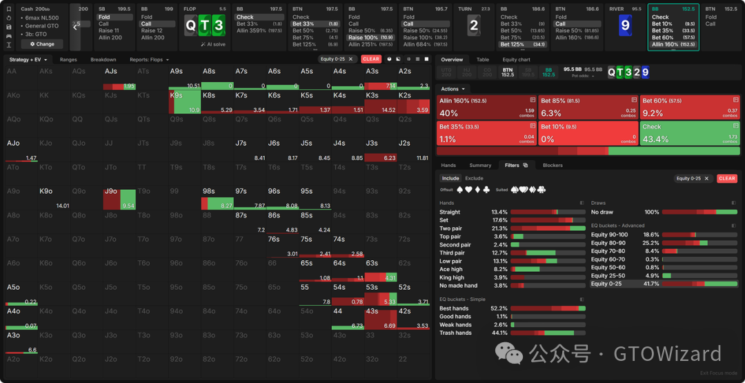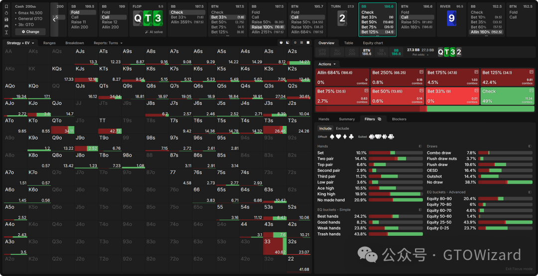 BTN vs BB 的单次加注底池,有效筹码 200bb。在 Q♠T♣3♣的翻牌圈,BTN 持续下注,BB 过牌加注,BTN 跟注。在转牌 2♠上,BB 的首选尺度是超池下注。请记住这手牌开始时有 200bb 深,所以 BB 在采取这种激进路线时有很强的动机去极化。BB 在这个转牌圈的范围非常直观,价值牌集中在两对及更好的牌上,而诈唬则包括各种听牌和像 K3s 这样的牌,这些牌阻挡了 BTN 范围中的最强牌。