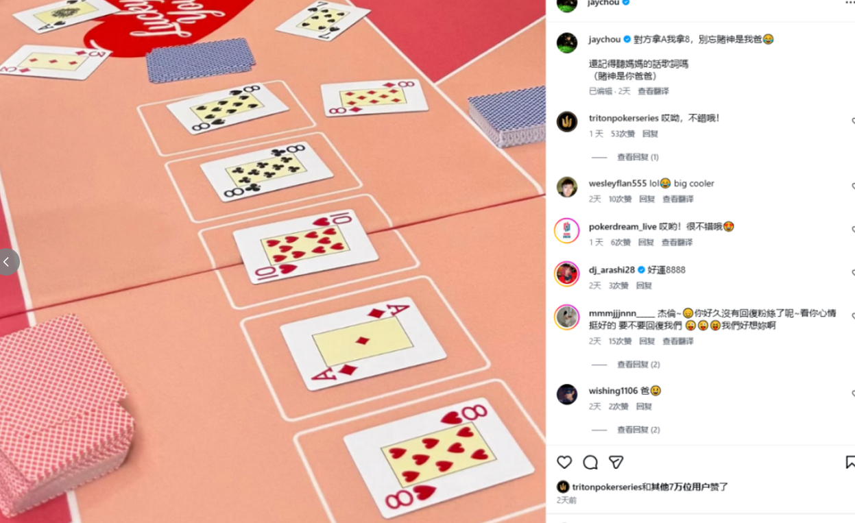 两天前,周杰伦在个人 IG 上,破天荒地发了一手德州扑克牌局截图,并配文: