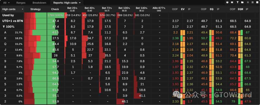 专业建议:在生成自定义报告之前,最好先手动通过 AI 运行几个特定的牌面结构,来预先测试你的假设 。如果它们在这小部分样本中成立,生成一个报告来自动化所有翻牌的解算过程,可以让你确认这个假设是否能作为一个通用的启发式规则。但是,如果你不用报告就能推翻你的假设,就可以避免不必要地花费 Power Credits。