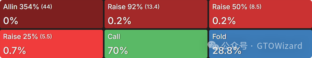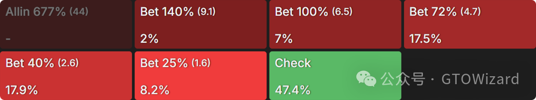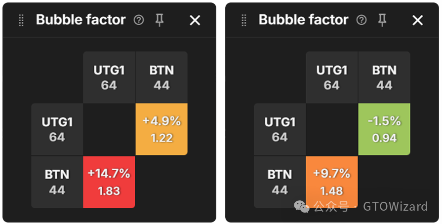 为了测试这个假设,我们在两个解算结果中都给 UTG+1 设置 40%底池的下注尺度,然后观察 BTN 在每个报告中的应对策略