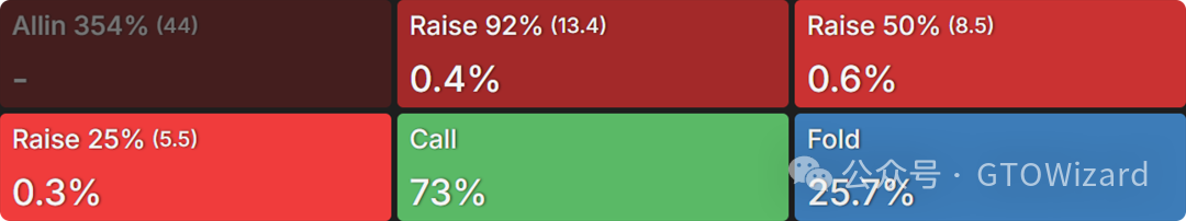 解释:尽管 UTG+1 在经典赛 ICM 解算结果中使用全压 3-bet 尺度的频率较低,但这个结论被证明是正确的。总体来说,在 PKO 赛中,即使作为被覆盖的玩家,我们也愿意比在经典赛中更频繁地冒着锦标赛生命的风险。