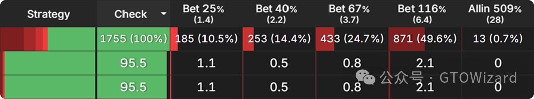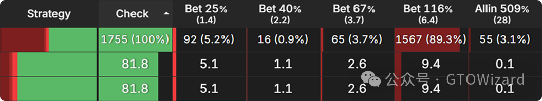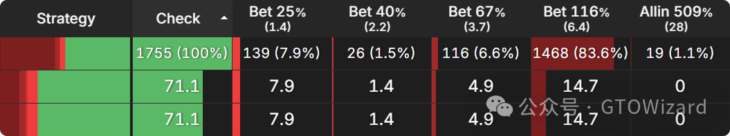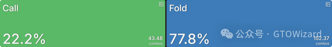 在第一个节点,行动轮到大盲位,他们在大多数翻牌圈通常会过牌。这是从三份报告中汇总的行动频率,涵盖了所有可能的翻牌圈: