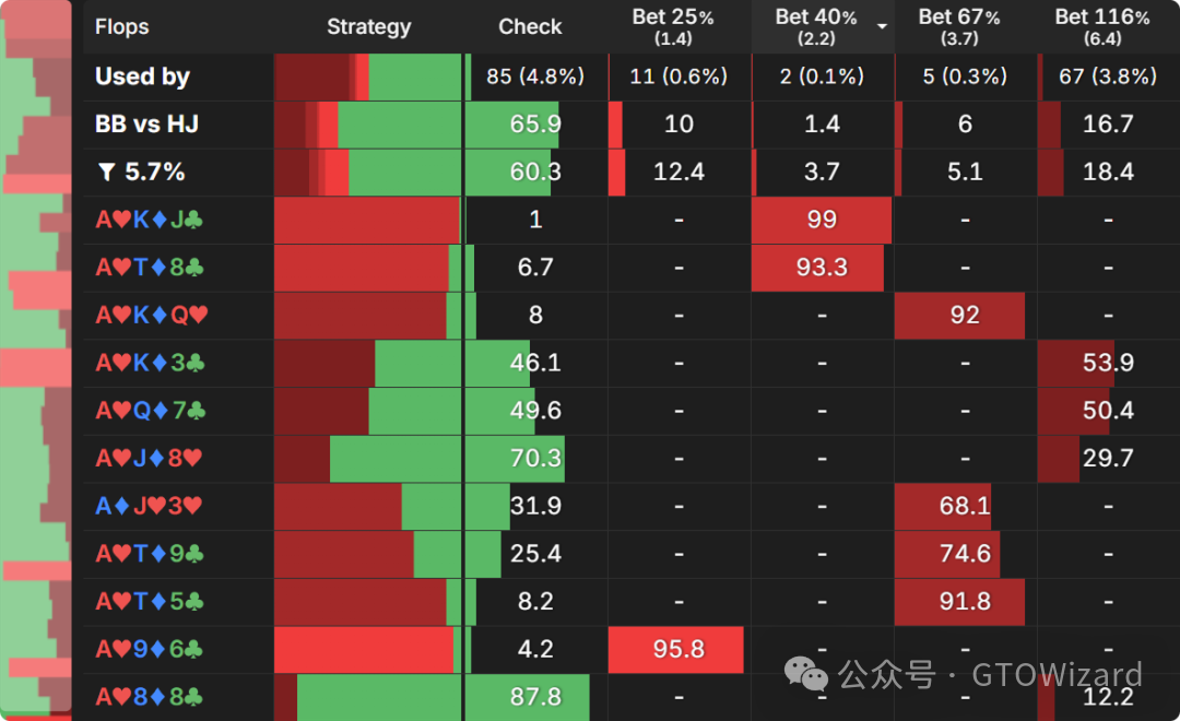 所有翻牌圈子集的翻牌圈报告,占比 5.7%。经过一些尝试和调整之后,我发现了以下这个牌面的打法发生了变化。