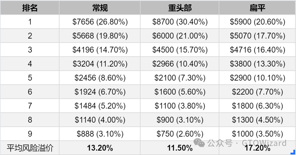 我们可以看到最高和最低的平均风险溢价存在 5.7%的差异,扁平奖金结构的决赛桌风险溢价是最高的。