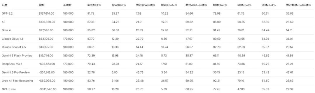 “三款超激进的AI最终排名靠前,这很有趣。中游的往往是那些更保守的AI。我认为Opus和Sonnet都打得相当合理。它们在手牌样本中都实现了盈利,具有合理的翻牌前策略:加注了合理数量的牌,防守了合理数量的牌。但看起来,这些策略似乎不足以抵挡某些AI不间断的、毫不留情的超激进攻击。”