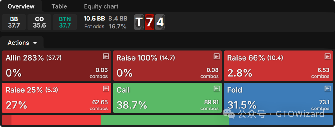 在三人底池中,BTN 对 CO 持续下注的应对看起来和 BTN 对 CO 翻前公开加注的应对很相似,都是跟注和加注的混合。在 T♠7♥4♠牌面上用 JTo 加注不仅可以让 BB 弃掉活的两高张 ,也就是单挑底池中权益拒绝最常见的目标,还可以让 BB 弃掉两头顺听牌、弱同花听牌、甚至更好的顶对。当 BB 弃牌而 CO 跟注时,JTo 有 60 到 63%的权益,这比最初面对持续下注时 BB 还在底池中的 47 到 52%有了显著提升。