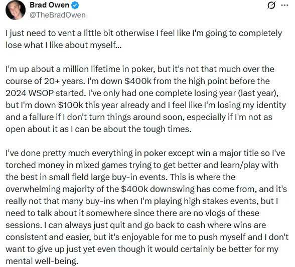 在2024年WSOP开始前,他处在个人资金曲线的高点,但之后经历了一波约40万刀(约280万RMB)的回撤。