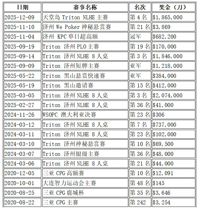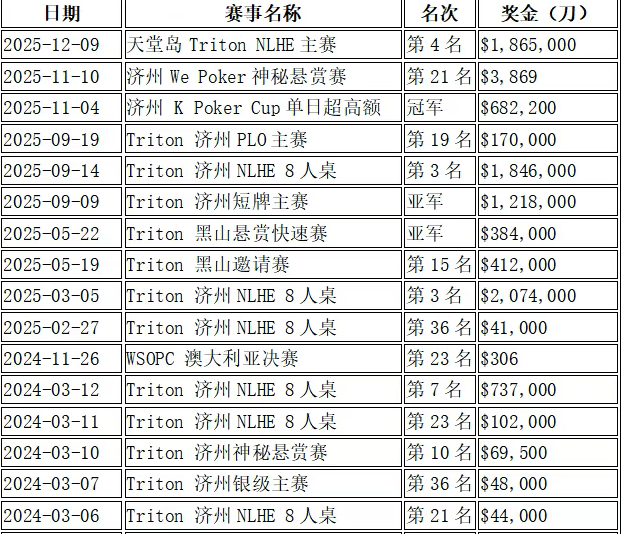 特别是传奇扑克(Triton Poker)系列赛,展现出在高风险、高回报的环境中稳定的竞技能力和盈利潜力。