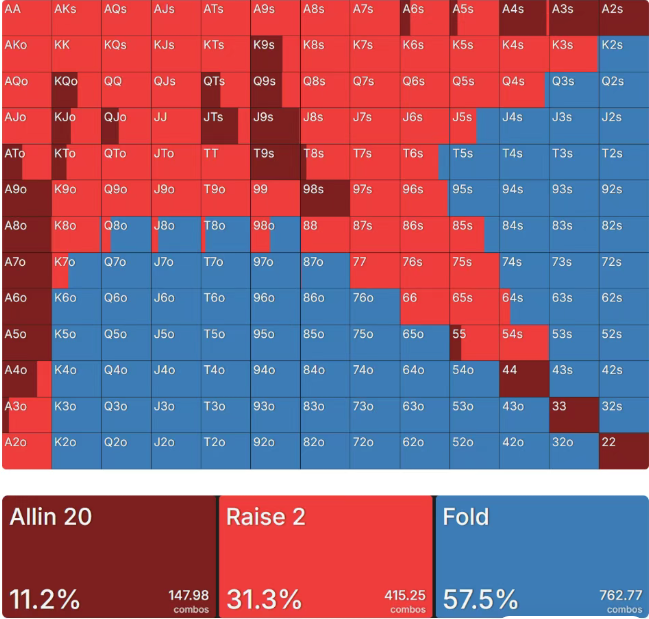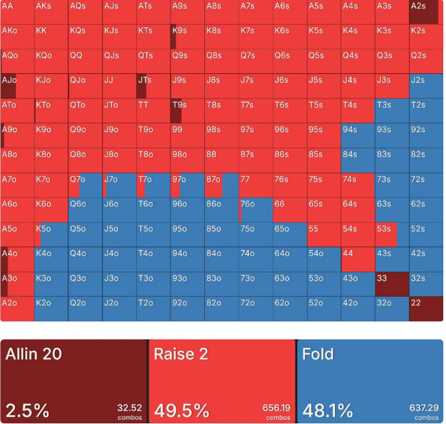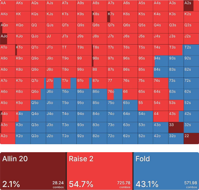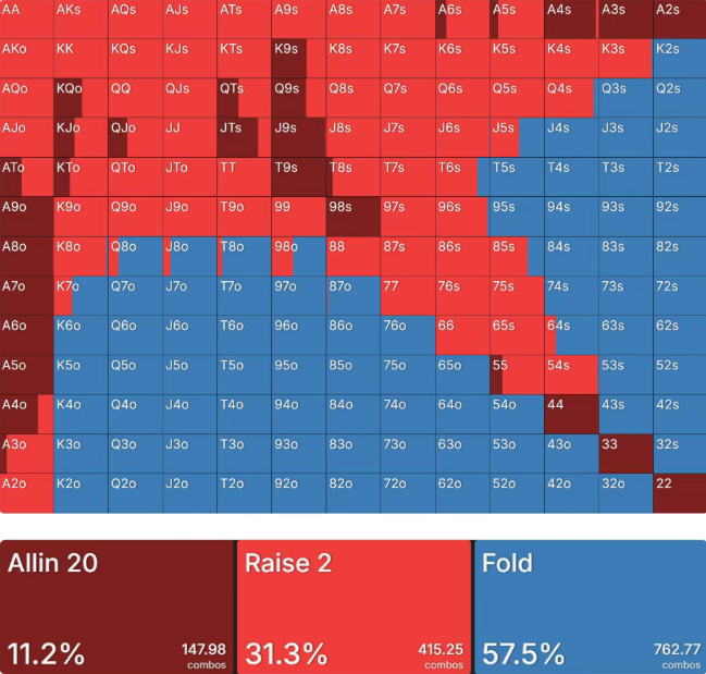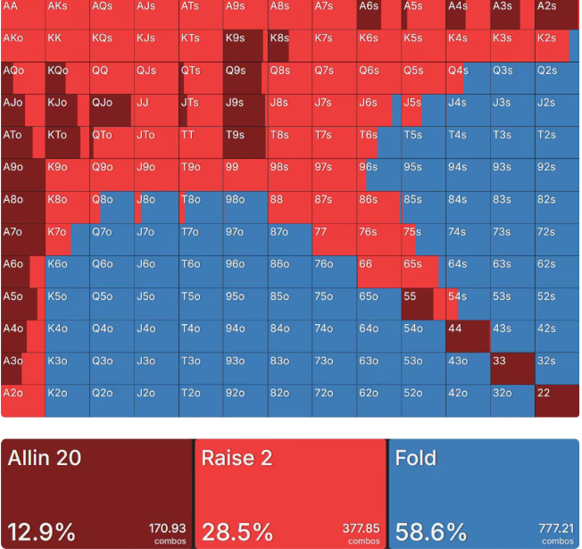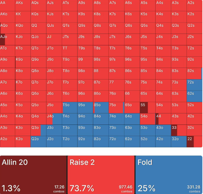 我一直在深入研究浅筹码打法。其中一个特别感兴趣的问题是:”作为第一个行动的玩家,我应该在什么时候选择最小加注开池,什么时候选择全压?“在 MTT 中,当筹码变浅到 25BB 及以下时,你会开始看到 solver 开始采用翻前直接全压的策略,尤其是后位。