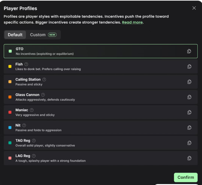 有些手牌更适合全压,有些手牌则更适合常规开池,我想研究一下剩余玩家的倾向会如何影响这一决策。面对跟注站时,我们应该更多地选择全压还是开池,面对 Nit 时,我们的整体频率又会如何变化,这些问题现在都可以通过自定义翻前解算来探索。