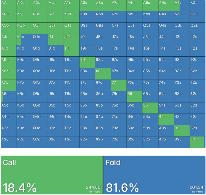 关键是要注意全压几乎从策略中消失了。这是因为我们不再担心翻前被诈唬加注逼走手牌。这类对手本质上让我们可以轻松打出完美的策略。当他们跟注时,我们知道他们的范围是封顶的。当他们全压时,我们知道他们处于范围的顶端,除了我们自己的顶端范围之外,其他手牌都可以弃牌。翻前用全压来拿下底池已经没有什么说服力了,事实上,我们真正想要的是让底池进入翻后。