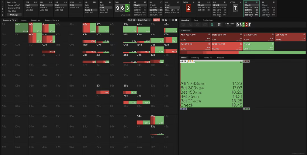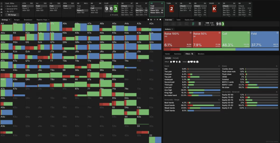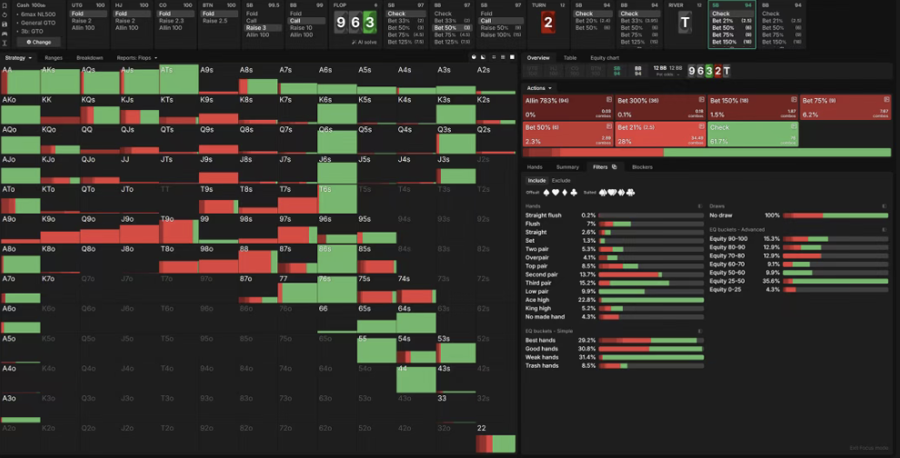 在这个针对上述同一场景的自定义 AI 解算中,我们讨论的是 BXB 行动线在 9♠6♣3♦ 2♥T♠ 牌面上的情况。结合我们之前学到的关于 SB 慢打一些同花和两对牌型”比如 T6 和 96″的知识,尝试使用节点锁定功能来调整 BB 在 SB 河牌过牌后的下注策略。强制 BB 打得更激进一些:“更薄的价值下注,允许超池下注”等等,并记录这些改变如何影响 SB 的应对方式。然后对一个过于被动的对手做同样的操作,比如“价值下注不够薄,不能超池下注”等等。