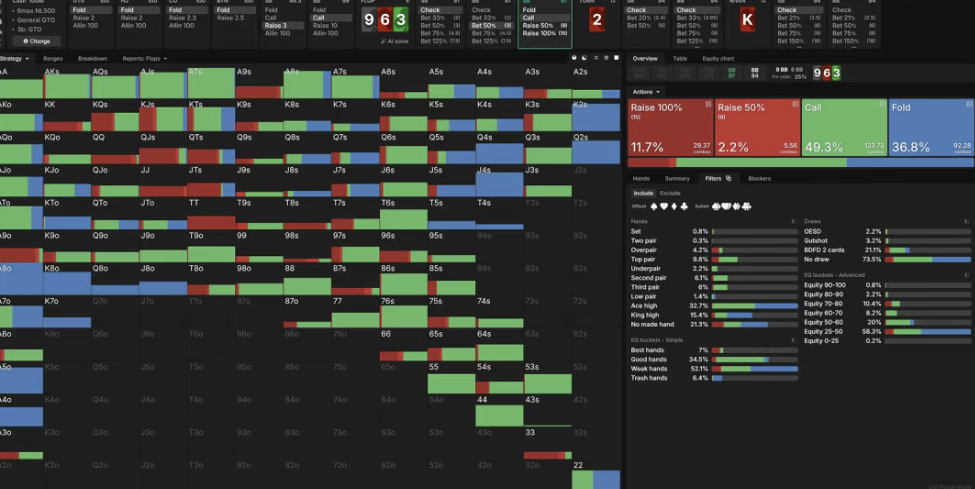 结果就是在听花面上 ,SB 会用更多摊牌价值手牌来过牌跟注,比如好的 A 高牌和低对或中对。而在彩虹面上 ,SB 会用更多带有后门听牌的弱高牌来缠打。我们直接上手来看看。