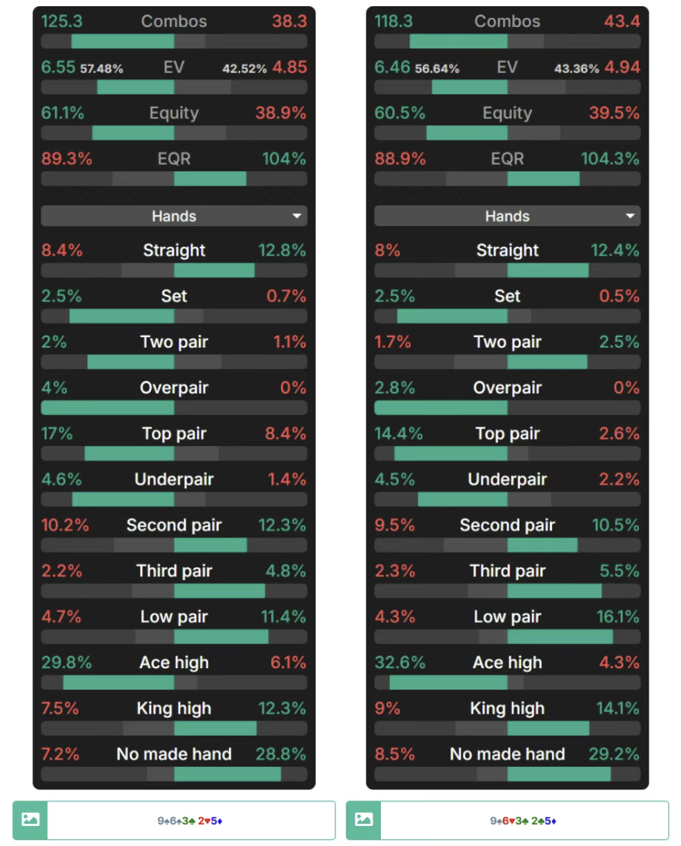 这是上述两种牌面场景的范围分析。左边是 9♠6♠3♣ 2♥5♦ 这个出张的范围对比,右边是 9♠6♥3♣ 2♣5♦。本质上是同一牌面,没有成花的出张,区别在于其中一个翻牌圈是听花面,另一个是转牌的后门听花。水平条里左侧是 SB (组合数多的那个),右侧是 BB。
