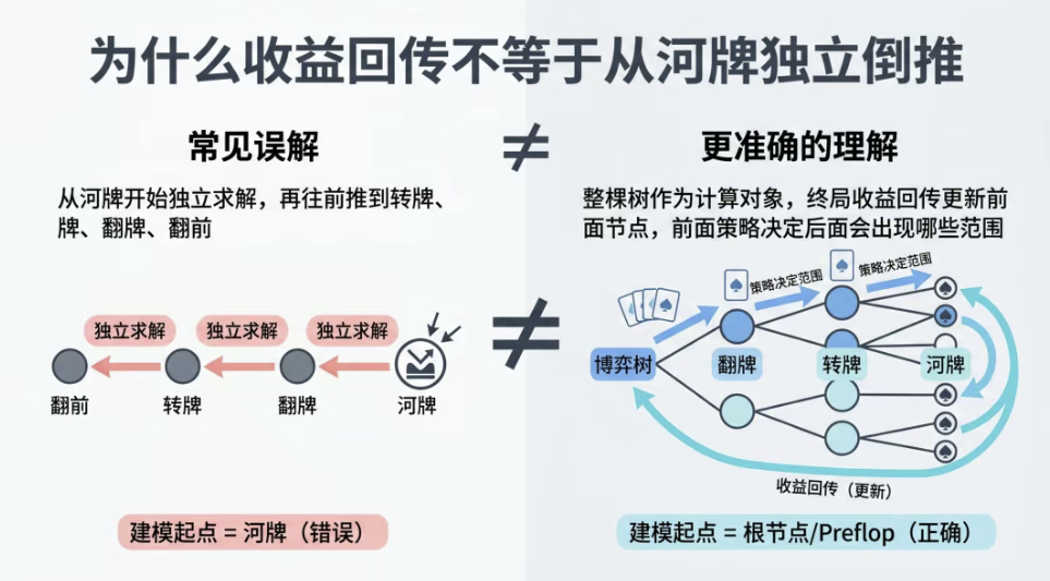 “收益从后往前回传” ≠ “算法从河牌开始独立求完整最优解”