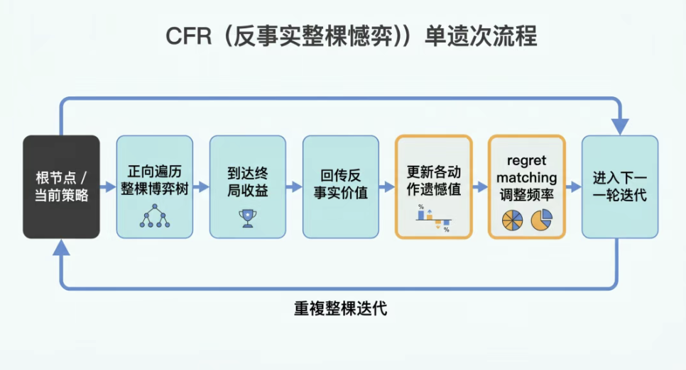 它是在整棵不完全信息博弈树上,基于当前策略反复遍历、比较反事实价值、累计遗憾、更新频率,最后让平均策略逐步逼近均衡。