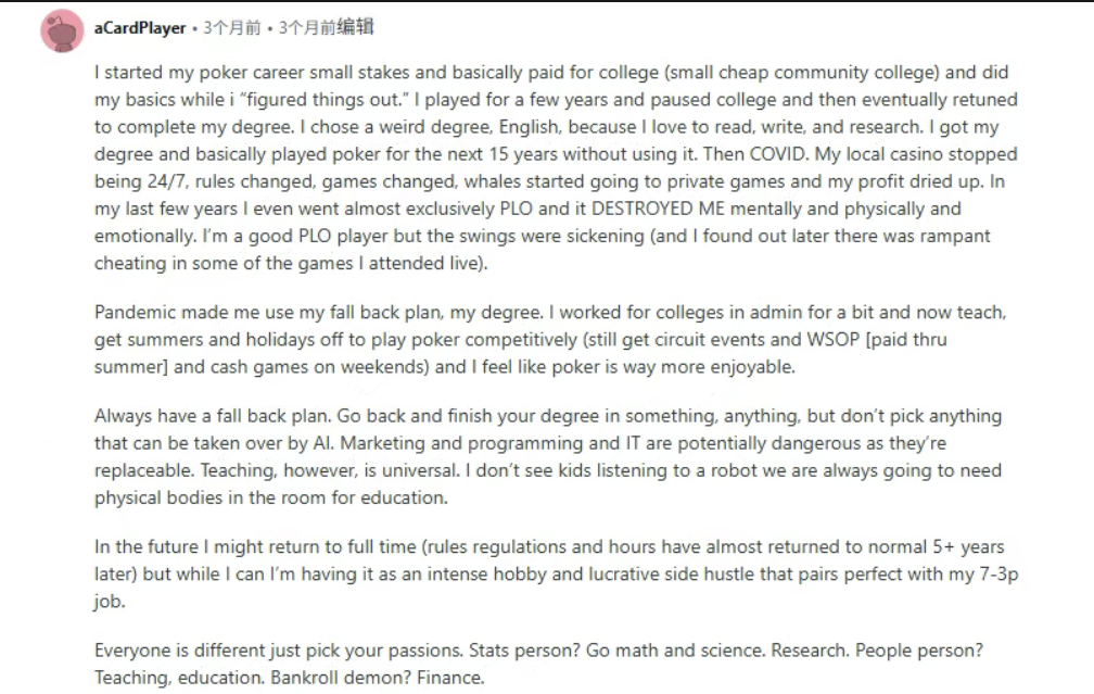 玩家打牌多年,疫情后游戏环境恶化收入骤降,最终靠之前的学历转型。