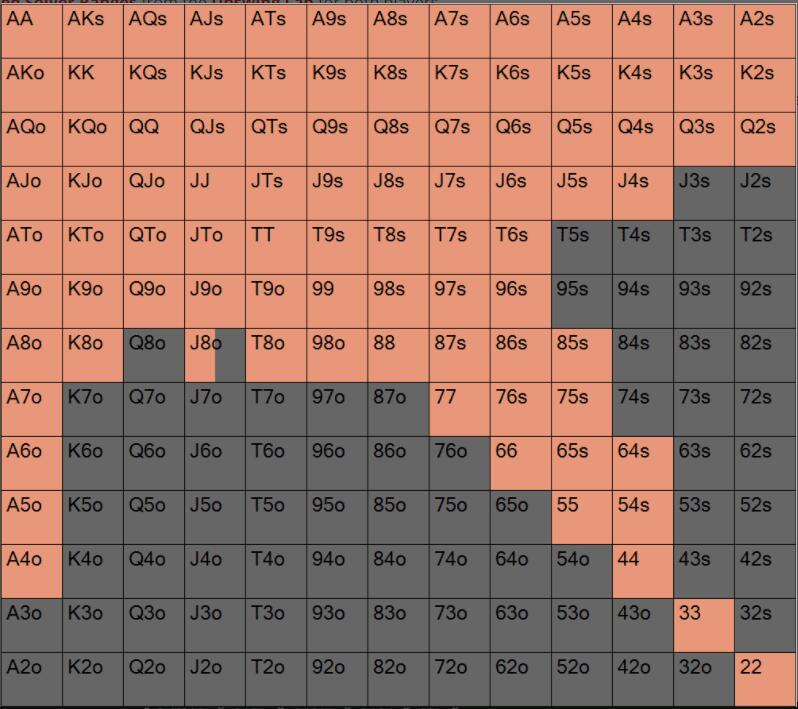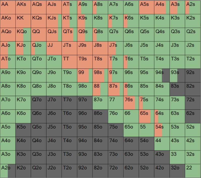 上图未显示胜率对比,但软件表明按钮玩家有50.23%胜率,大盲玩家有49.77%胜率。以下是这种优势如何影响每个牌手的策略: