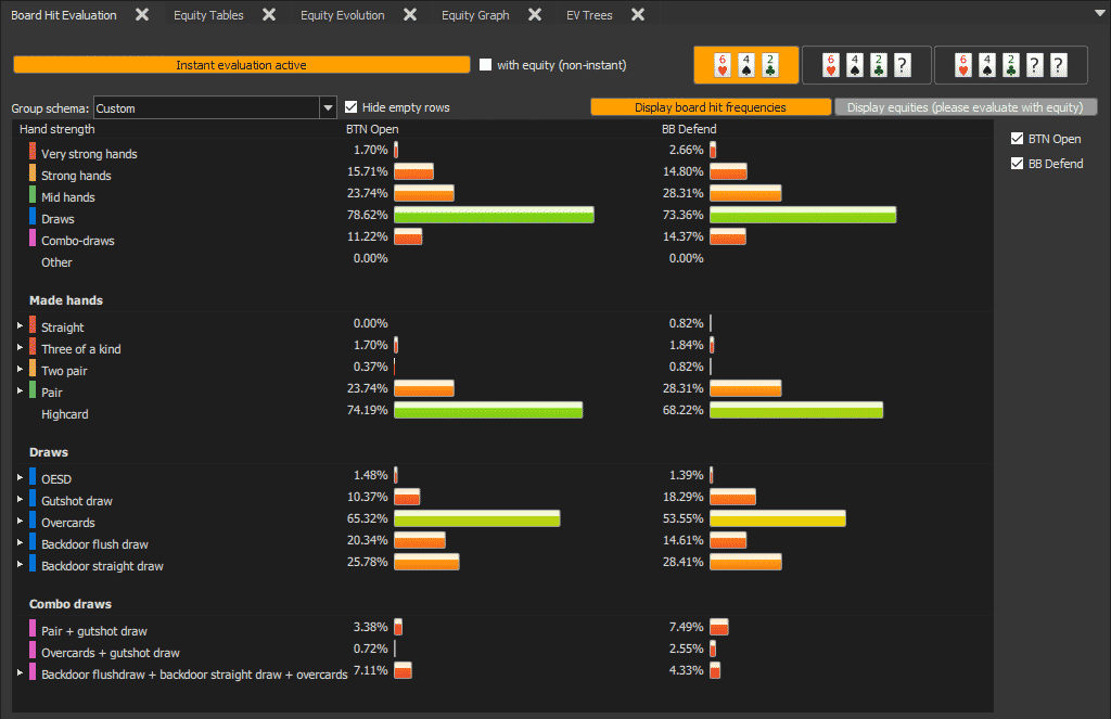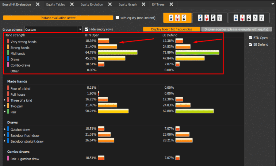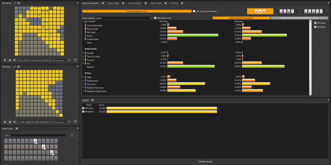 按钮玩家在这里也有很大的胜率优势(56.62%)。软件还告诉我们,两个牌手有相近比例的中等牌和听牌。这种巨大差异有两个原因: