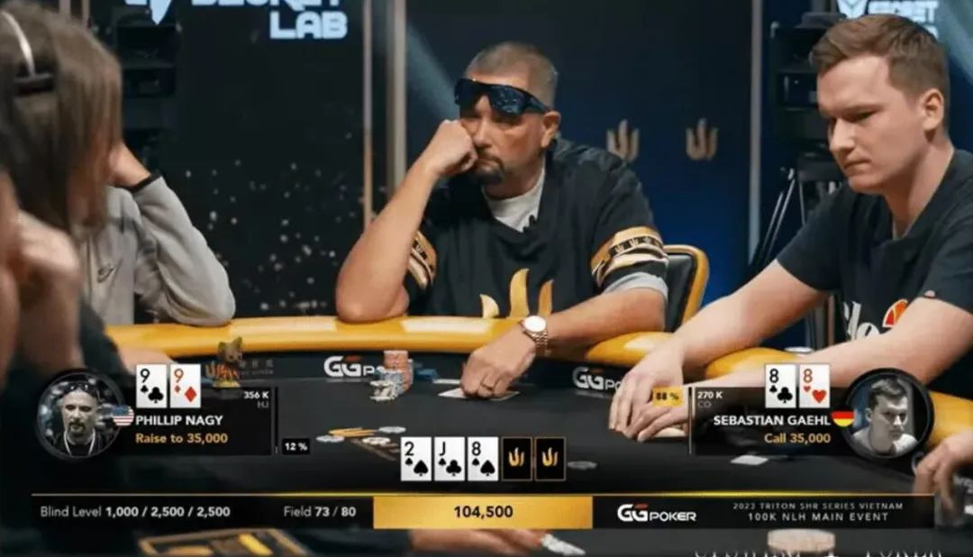 虽然在这个100,000美元买入的比赛中挤满了精英级别的牌手,但Gaehl却得到了一个在某扑克网站老板Phil Nagy左边的座位,后者被认为是个松散的娱乐玩家。