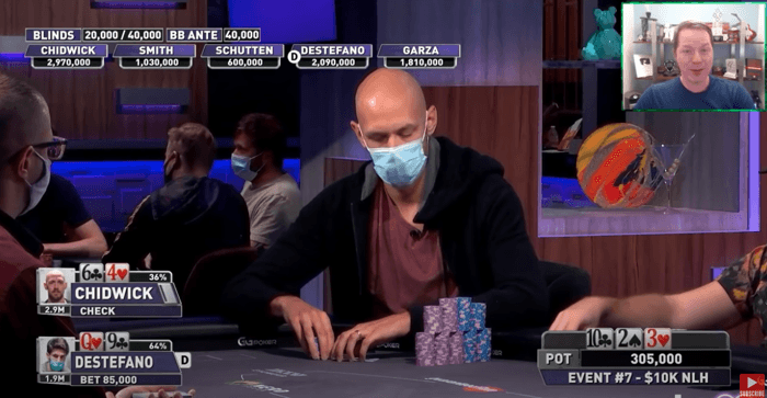 因为桌上有一个短筹码选手,Chidwick可以给Destefano这样的中筹码对手施压,因此他在这里可以用较宽的范围防守。
