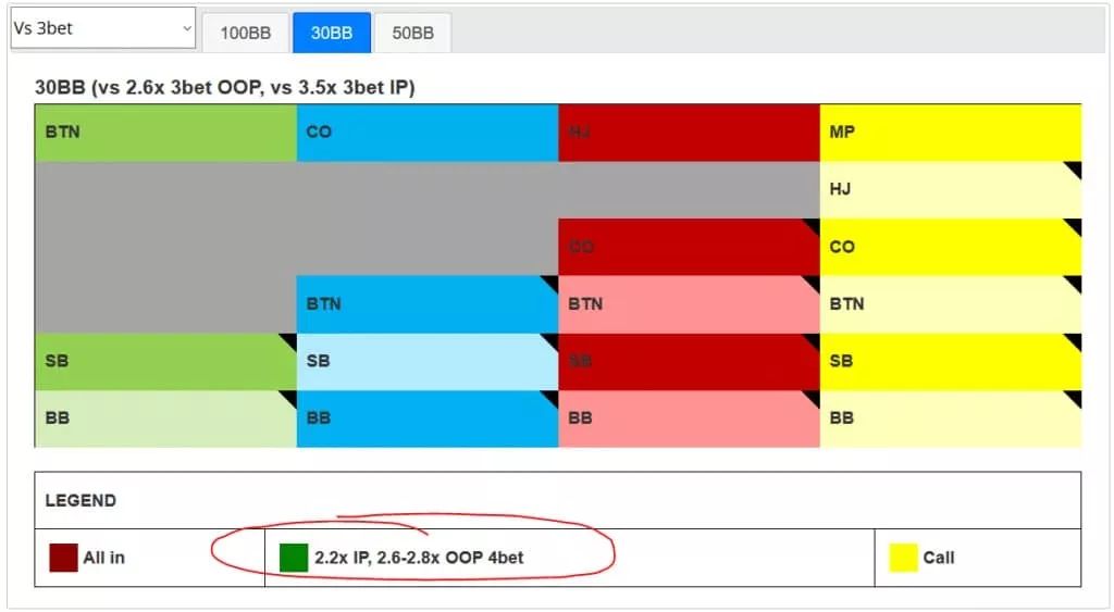 对按钮玩家范围打击最大的4bet尺度约为他3bet尺度的2.75到3倍。