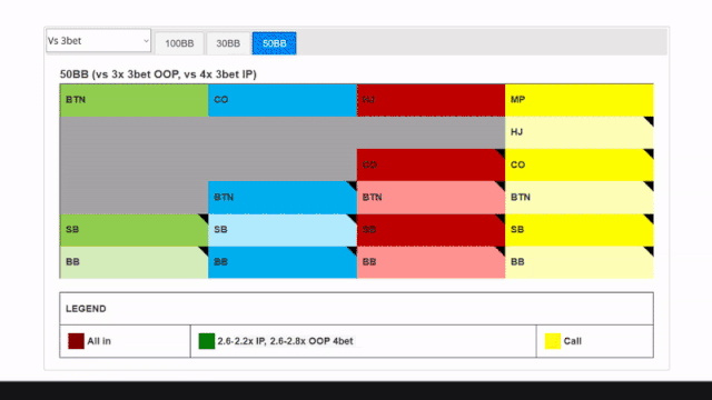 一旦筹码量趋近50BB,大多数场合最喜欢的 4bet尺度是全压。但在某些场合他建议采用一种窄范围的非全压4bet策略,同时搭配一种宽范围的4bet全压范围。例如,筹码量50BB时他的中间位置对抗劫位3bet图表: