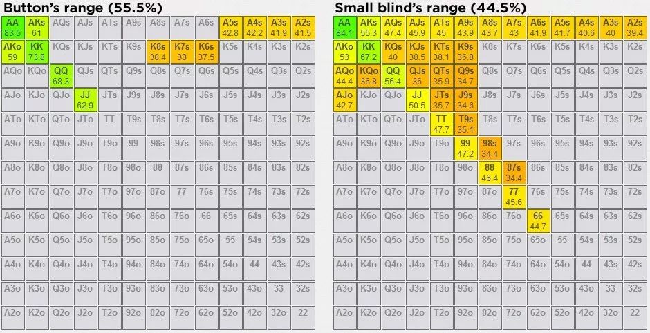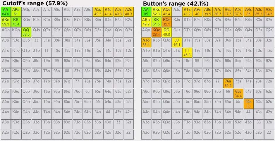 这个下注尺度也迫使小盲玩家用其范围中的相当一部分防守:
