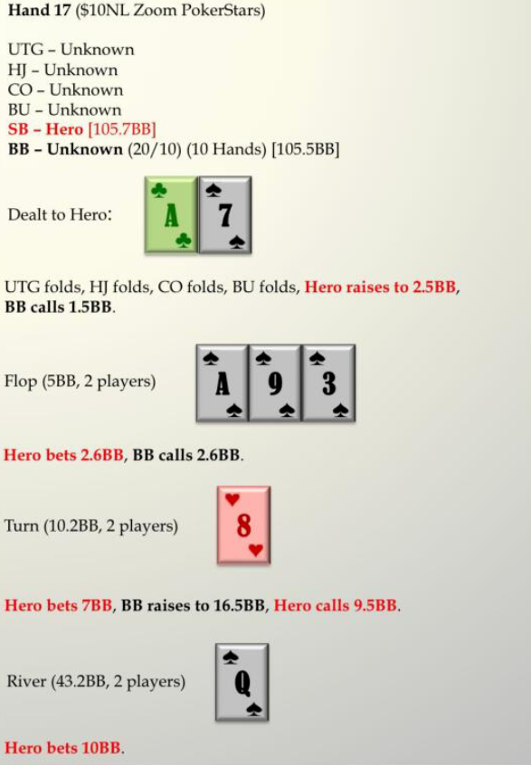 翻牌:A♠9♠3♠,Hero下注2.6BB,大盲跟注。转牌:8♥,Hero下注7BB,大盲位置玩家加注到16.5BB,Hero跟注。河牌:Q♠,Hero下注10BB。