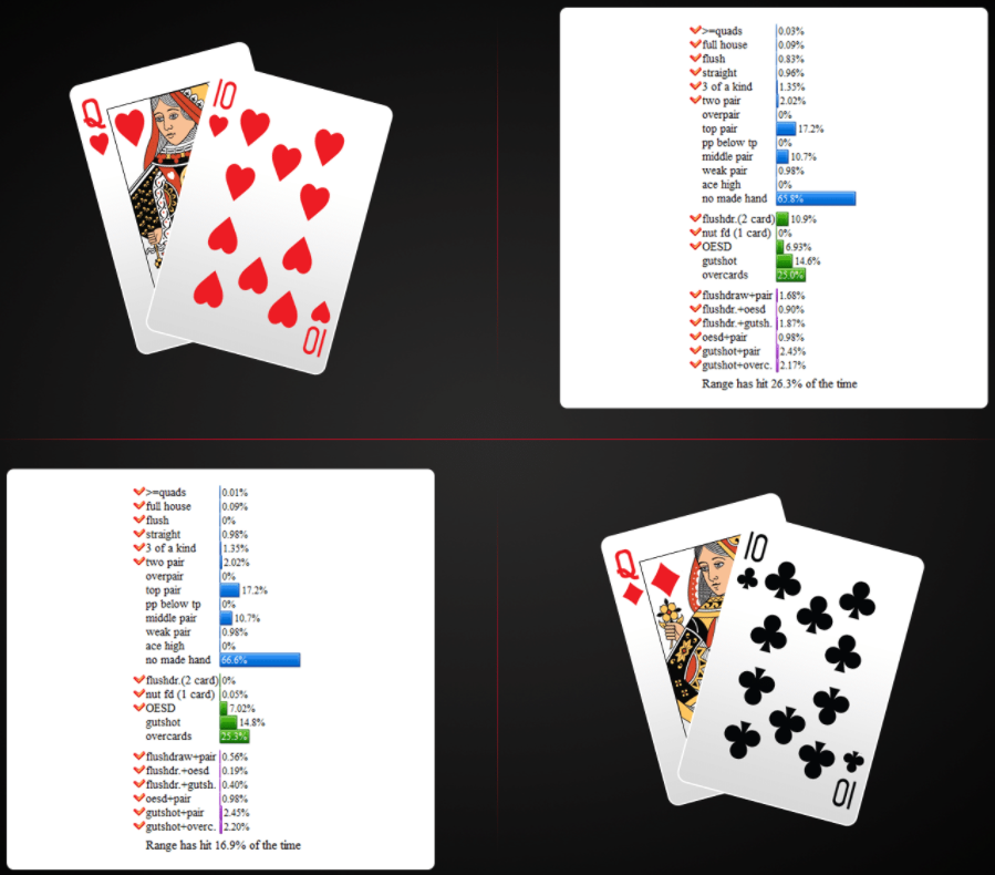 至于同花连牌的话,我们来看看一手牌即是同花又是连牌的价值,我们会利用Flopzilla(计算起手牌中牌概率的软件)来比较QTo和QTs(s代表suited,指同样花色)这两种牌型。