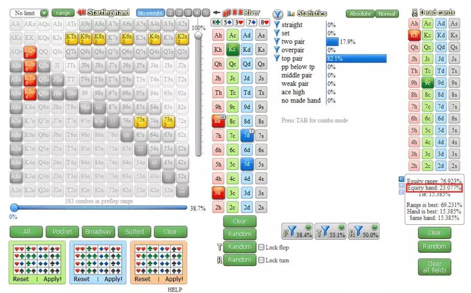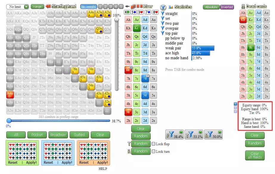 - 跟注比平时更紧一些,因为对手河牌圈下注范围可能缺少诈唬牌,而且价值下注比较宽。这意味着我们正常的抓诈范围,会因为排除了较底端的那部分而缩小。但好消息是,抓诈范围的顶端部分现在将更多地实现其底池权益。