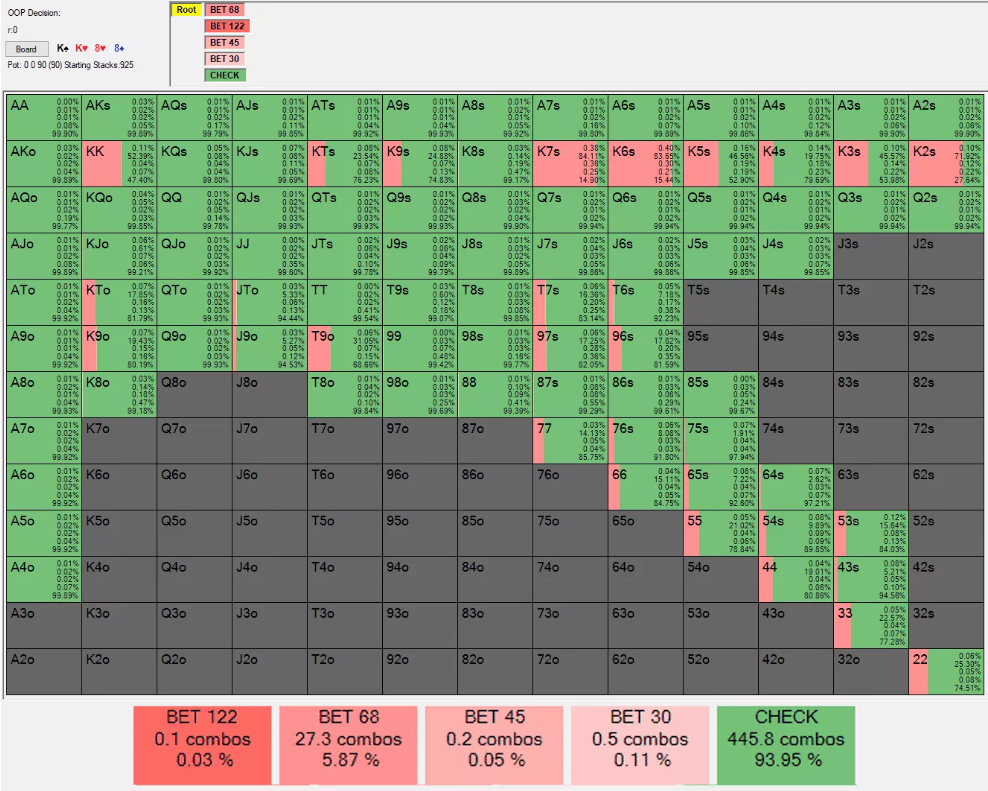 坚果听牌作为下注与加注选择具有显而易见的吸引力:它们既能享受弃牌权益,有时甚至能迫使更强手牌弃牌,同时在对手未立即弃牌时仍具备赢取巨额底池的潜力。 然而求解器并不总是激进地游戏坚果听牌。例如在100bb的CO vs BB单次加注底池中,CO...