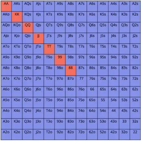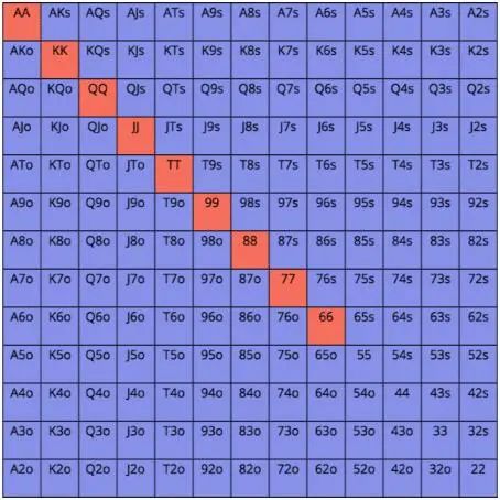 ● 在前注生效的场合,我们可以在任何位置用所有对子做有利可图的率先加注(除了小盲位置,在这个位置跛入和混合策略是可行的)。