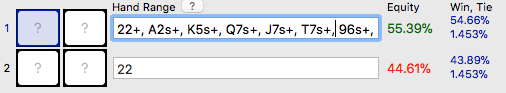 然而,我们可以做有利可图的全压。我们的牌可能严格意义上落后于HiJack玩家的范围(44.6% 小于50%),但我们的全压将生成许多弃牌赢率。我们的对手会放弃他范围中的大部分牌,比如86s、A5o和J7s,即使他真的跟注,我们的22仍然有不错的胜率。例如,如果对手用88+、AQ+、KQs和AJs跟注这个25BB全压,我们将在约35%的时候获胜。