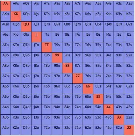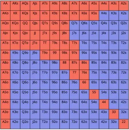 我们在CO位置和HiJack位置也可以用任何小口袋对子做有利可图的全压。LoJack位置是第一个我们不再能够用所有口袋对子全压并盈利的位置——在这个位置可以全压并盈利的口袋对子是44+。