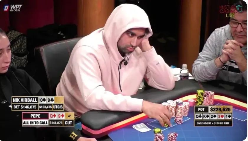 Pepe在三分半钟的时间里一直沉浸在牌局中,最后才弃牌,结果被Nik Airball像老大一样亮出了10-high,赢得了229,825的巨额彩池。