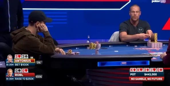 Antonius用一对3击中葫芦后,面对罗Robl在河牌的加注,他再加注虽然不可能,但从数学角度看,跟注几乎是不可避免的。