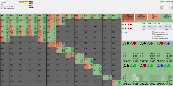 ● 哪些牌应采用混合策略(例如,有些时候check,其余时候下注)