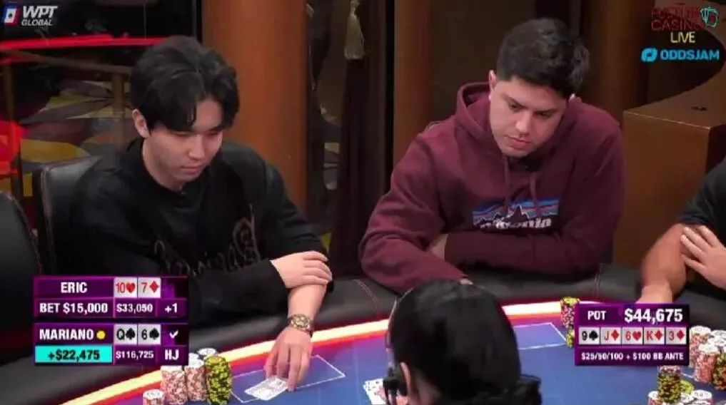 游戏盲注级别:$25/$50/$100。这手牌开始时,Mariano的筹码量比Eric多。