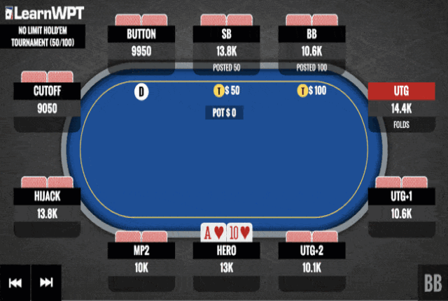 这是某个扑克锦标赛中的一局牌。当时盲注是50/100,桌上玩家筹码量如图。翻前,你在MP1位置用A♥ 10♥率先加注到300,然后得到了包括大、小盲玩家在内的五个牌手的跟注。底池现在有1800筹码。翻牌是A♦ 9♠ 8♠。小盲玩家领先下注1200,然后大盲玩家加注到3600。现在轮到你行动。你应该如何游戏?——跟注?再加注?弃牌?