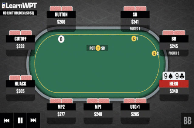 我们对于对手底牌范围的推测明显影响了9♠ 9♣ 在这手牌的理想玩法。对抗一个1/3刀常规局的未知对手,通常弃牌就好。