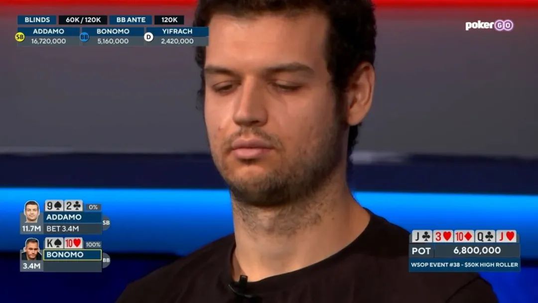 河牌的J让牌面组成公对,Addamol宣布全下来给Bonomo施加最大压力。