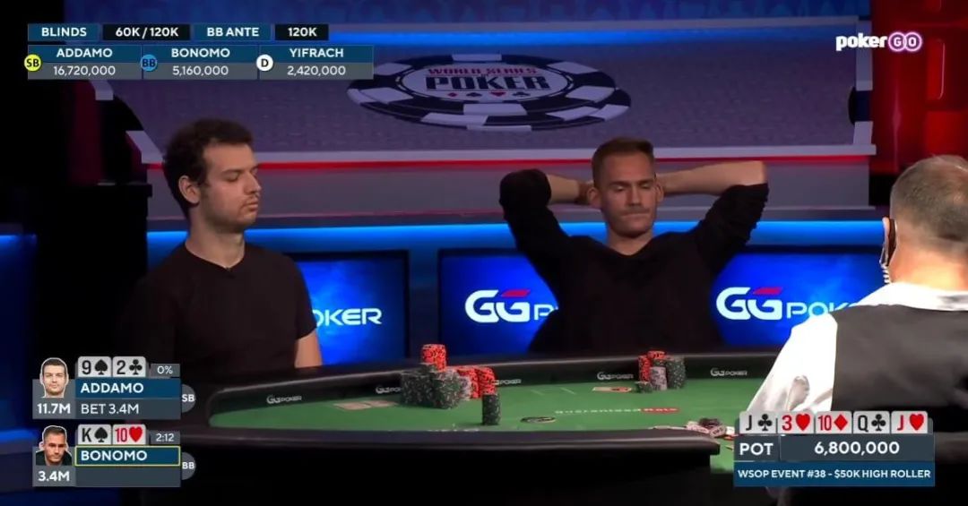 当时赛事#38:$50,000 High Roller的决赛桌只剩下最后3名玩家。Michael Addamo,Justin Bonomo和Gal Yifrach在激烈争夺冠军奖金$1,132,968。(第二名和第三名的奖金分别是$700,228和$495,305。)