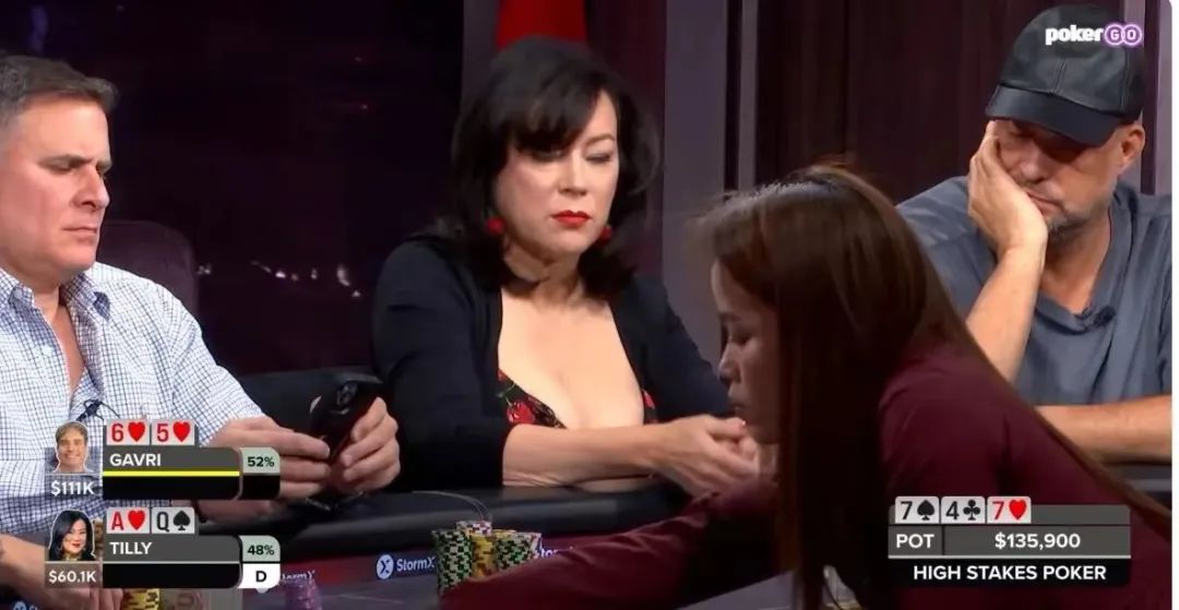 然而,Jennifer Tilly决定大干一场,她只用A-high 3-bet 大注。Gavri觉得价格太便宜了,于是跟注。