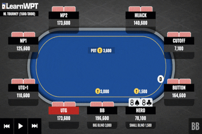 因为与我们不应该跟注相同的原因,我们不应该给大盲玩家可感知的弃牌赢率。我们的8♠ 8♣太脆弱,无法引诱进一步行动。