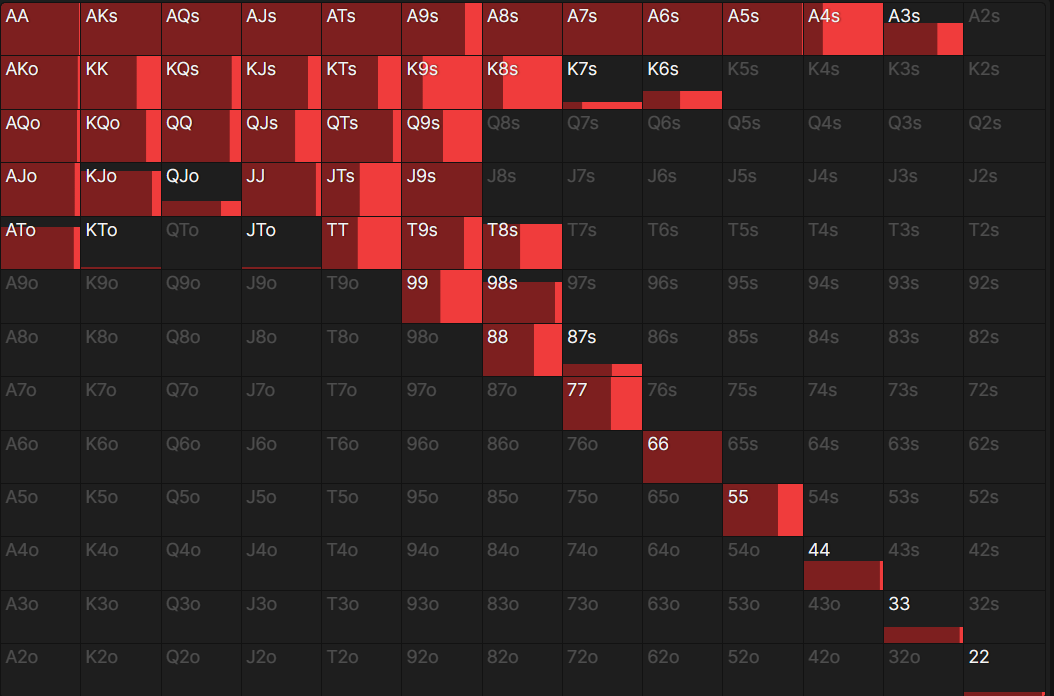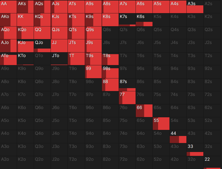 第二个下注范围的混合要少得多。像 AK 这样的价值牌在 GTO 版本中混合在一起,以保护较小的下注范围,但在第二个例子中,它是纯粹的超注。大多数价值牌,即使是非常薄的价值牌,现在都是超注。