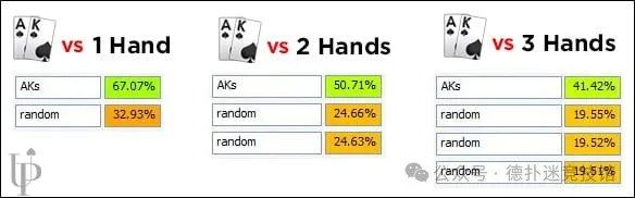 随着进入底池的玩家越来越多,你的范围的胜率也会随之减少。我们来看看AK分别对抗一手、两手、三手随机牌的胜率: