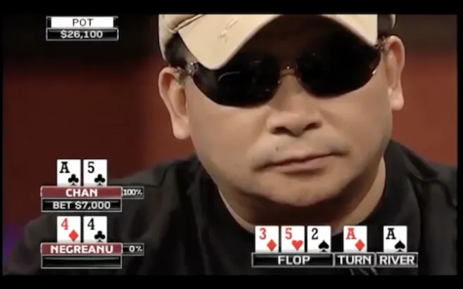 丹牛分析了几年前和Johnny Chan打的一手牌,他说这证明了剥削策略的有效性。它实际上是一个“根据 GTO 错误”的弃牌 ,但在特定情况下绝对正确。一个“剥削性”的弃牌,正是因为丹牛玩的是对手而不是理论。
