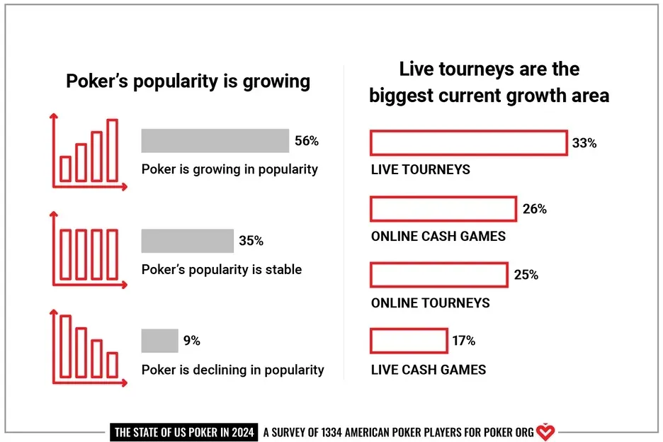 当被问及是否同意扑克的受欢迎程度正在增长时,56%的人表示同意。仅有9%的人认为扑克在走下坡路,其余35%的人认为扑克的受欢迎程度保持稳定。