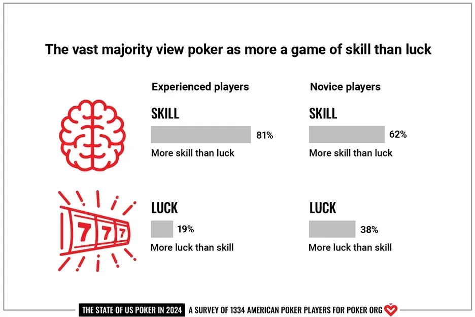 这也是数据中反映出来的趋势:与新手玩家 (62%) 相比,经验丰富的玩家 (81%)更有可能将扑克视为一种需要更多技巧而不是运气的游戏。但事实上,两组都承认关键技能成分让我们很高兴 – 这就是为什么我们有一个 扑克策略首先部分。